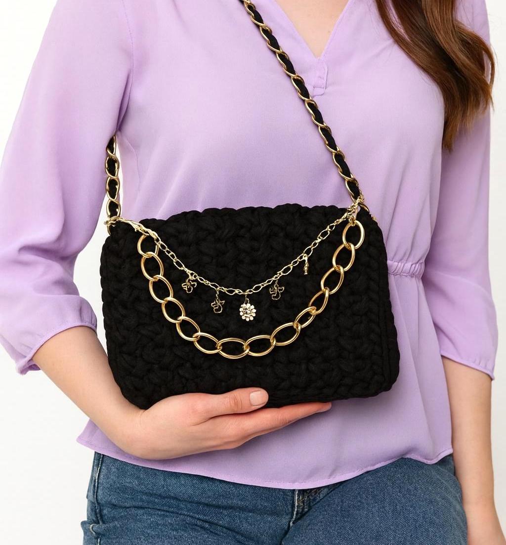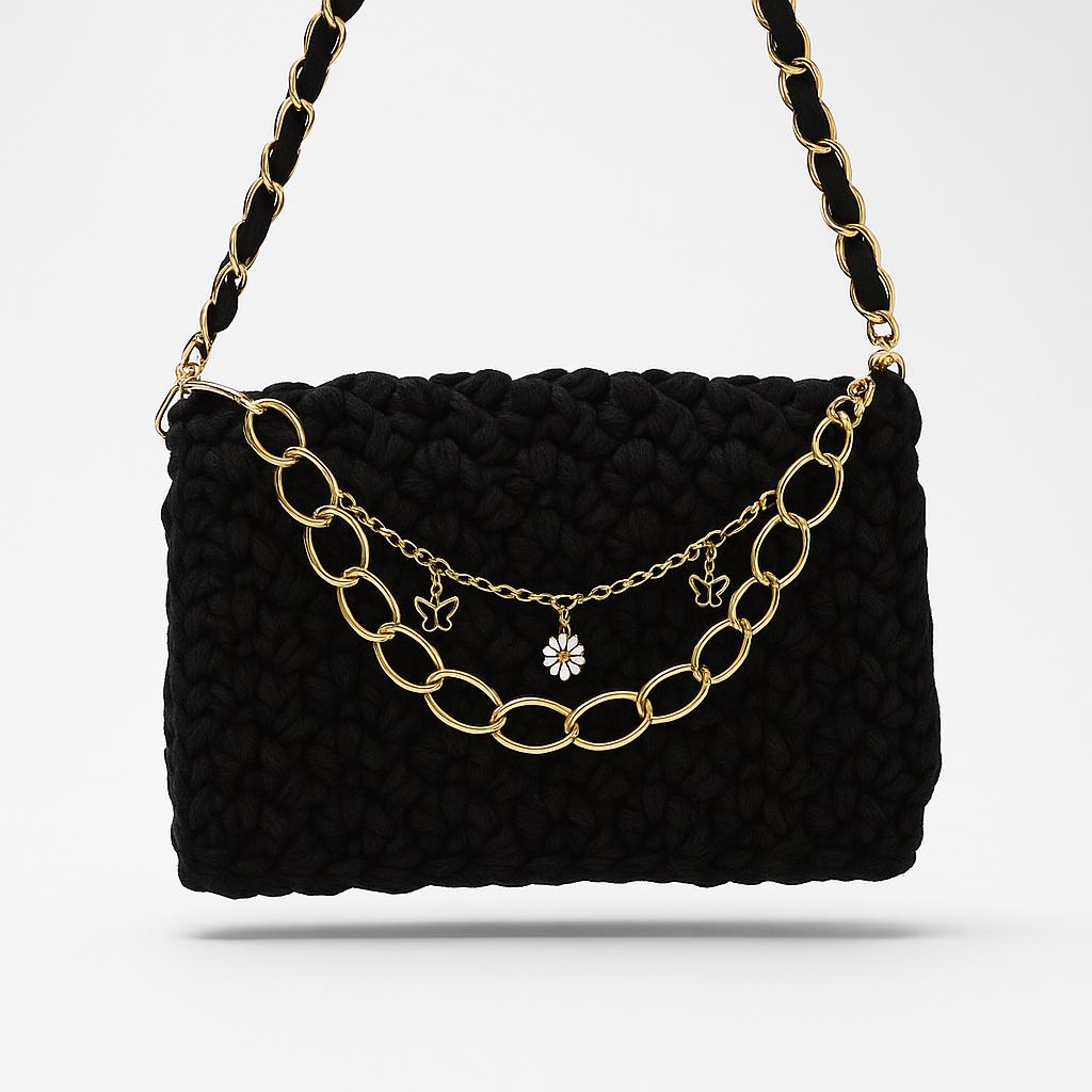 Add a touch of elegance and sophistication to your look with this stunning Handmade Crochet Shoulder Bag. Made from soft yarn, this bag features a unique woven crochet design that exudes delicate femininity. It comes in three beautiful colours, each adorned with pearl beads woven into the design. The black version also has metal accessories for added refinement.